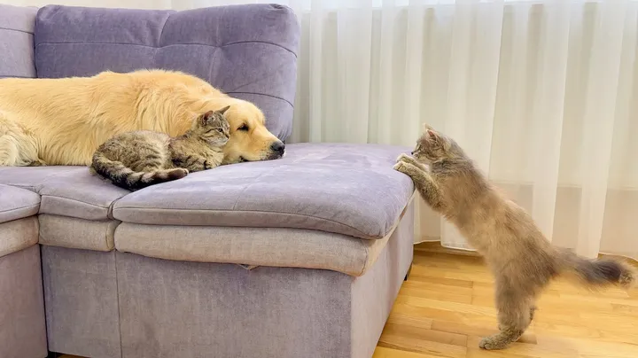 What Does Kitten do When It Finds Sleeping Golden Retriever With Another Kitten